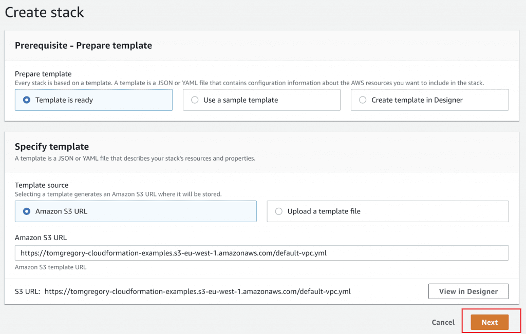 Click Next three times to accept all the default options, then on the final page click Create stack.