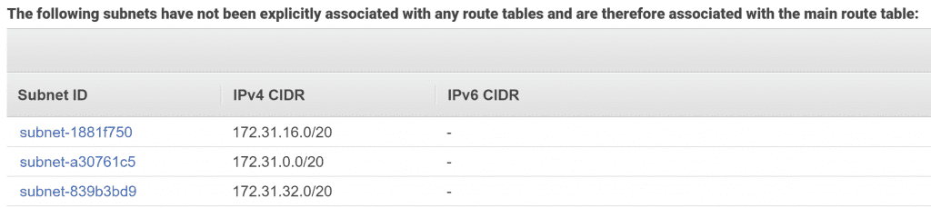 Finally, clicking on the Subnet Associations tab of the route table will tell us which subnets it's applied to. There are three subnets listed, which correspond to the three default subnets created by AWS. You might see more or fewer subnets depending on which region you're in.