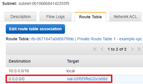 However, if you go to the details of one of the private subnets and click the Route Table tab, you'll see something different:
