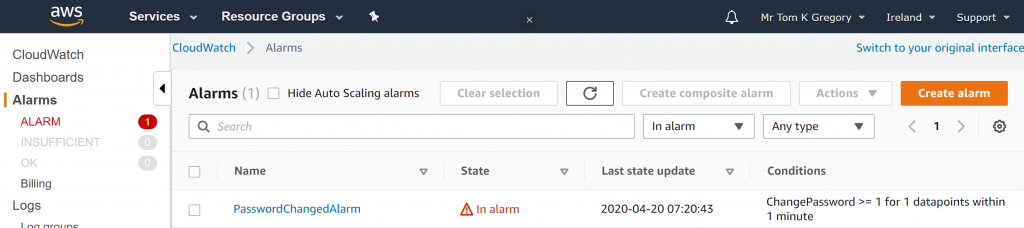 First off, let's see that the alarm has been raised correctly in CloudWatch.