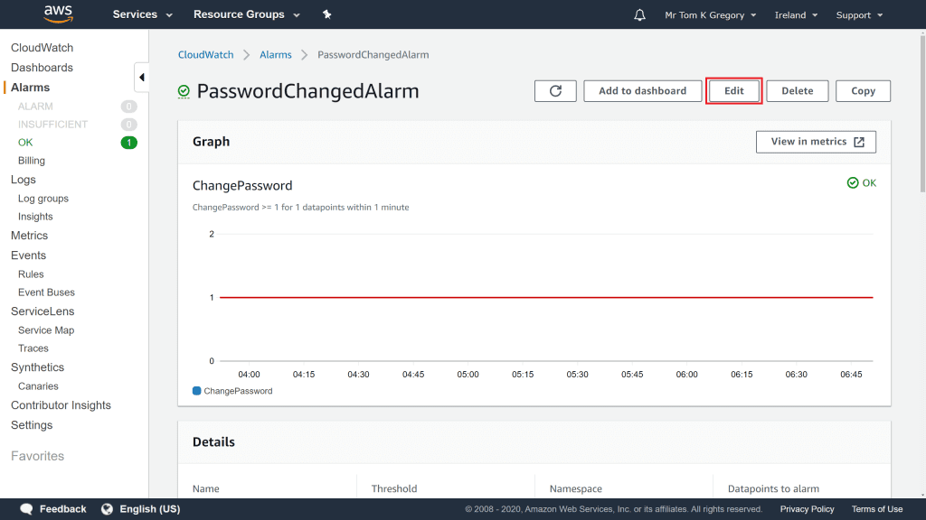 In CloudWatch, navigate to the alarm details for an existing alarm (if you don't have one follow the full example in the next section). Select Edit: