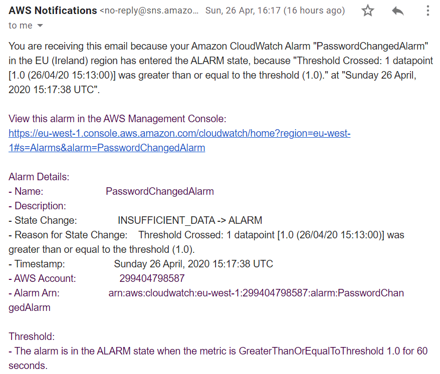 Alarm: Type: AWS::CloudWatch::Alarm Properties: AlarmName: PasswordChangedAlarm AlarmActions: