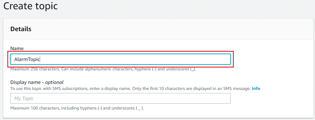 On the Create topic page you just need to specify a topic name. Type in something appropriate, then select the Create topic button at the bottom:
