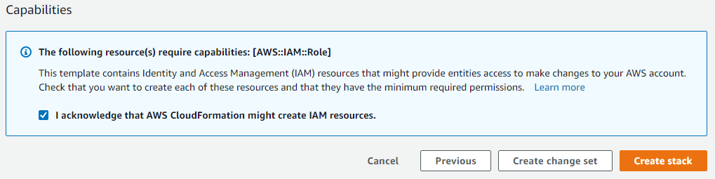 Keep clicking the Next button, then on the last page before you click Create stack select the checkbox to allow this stack to create IAM resources: