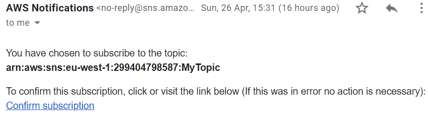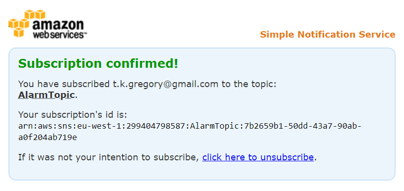 You'll get an email from AWS. Open it up and click the confirm link to confirm the subscription: