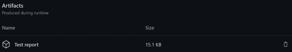 path: build/reports/tests/testSelecting the individual test run in the UI, you'll see the artifact at the bottom of the page. You can click on it to download the zip file containing the test reports. Nice!