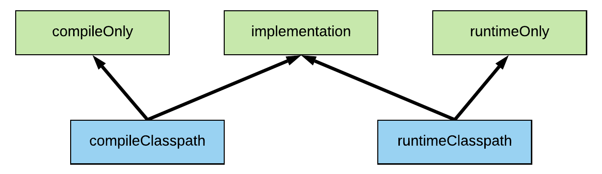 compileClasspathis created from the dependencies declared against thecompileOnlyandimplementationdependency configurationsruntimeClasspathis created from the dependencies declared against theimplementationandruntimeOnlydependency configurations