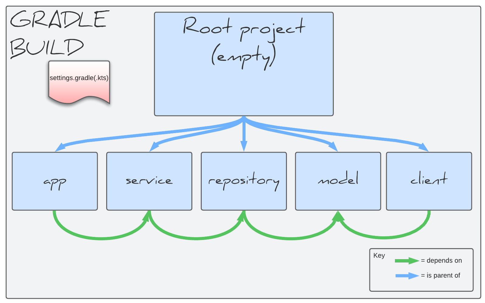 In a multi-project build a small code change only requires building the changed subproject and any dependent projects. For example, changing service requires rebuilding app and service, but not repository.