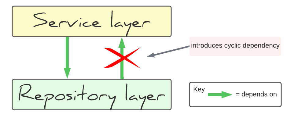 But a dependency from the repository layer to the service layer would introduce a cyclic dependency. Cyclic dependencies create unnecessary coupling, which prohibits understanding, reuse, and maintainability.
