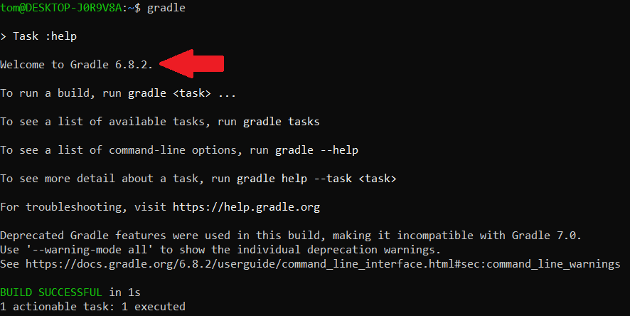 Notice in the output it prints the version of Gradle. This is the version of the Gradle installation on the machine where the gradle command is run. This may sound obvious, but it's an important distinction to make when we come to talk about gradlew shortly.