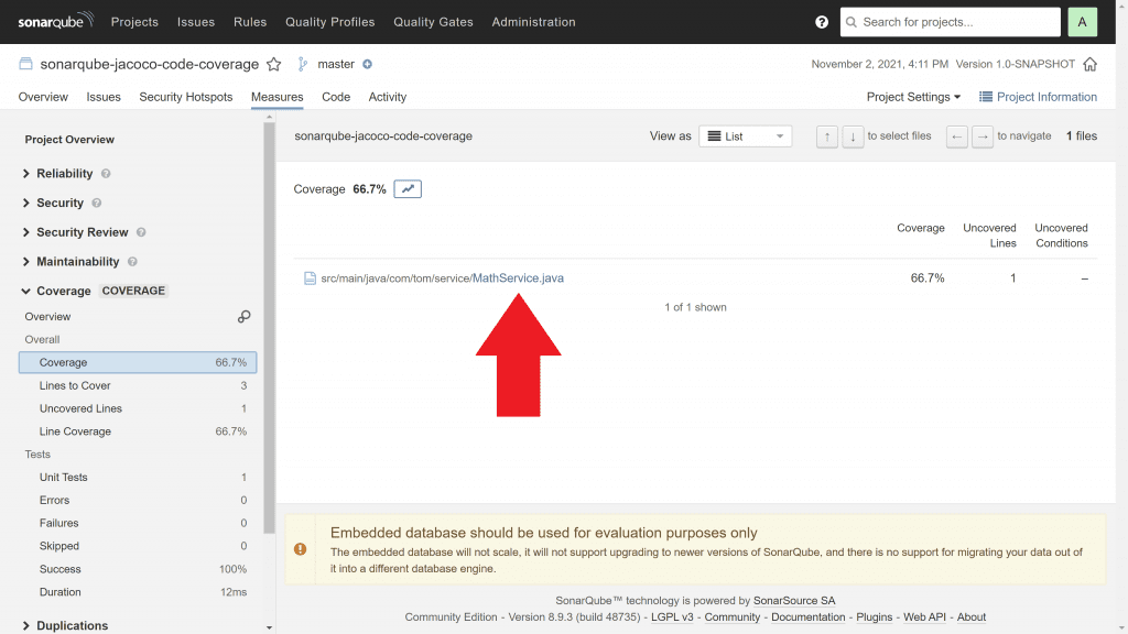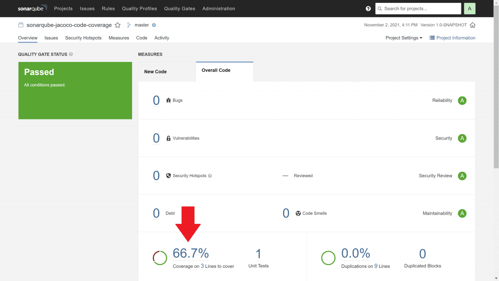 We can head back to SonarQube at localhost:9000/projects to see the test code coverage report.