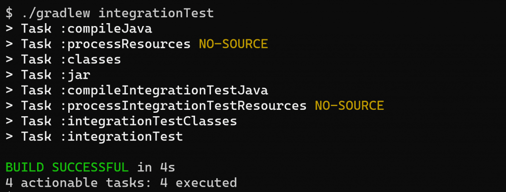 }Now when we run ./gradlew integrationTest Gradle executes any tests in src/integrationTest/java.