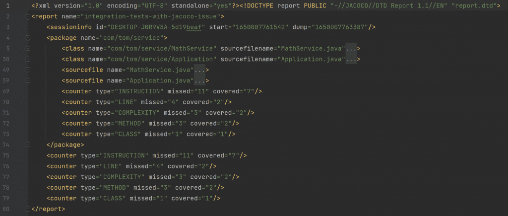 The XML file is a bit of a beast, with detailed code coverage data. But here's how a minified version looks.