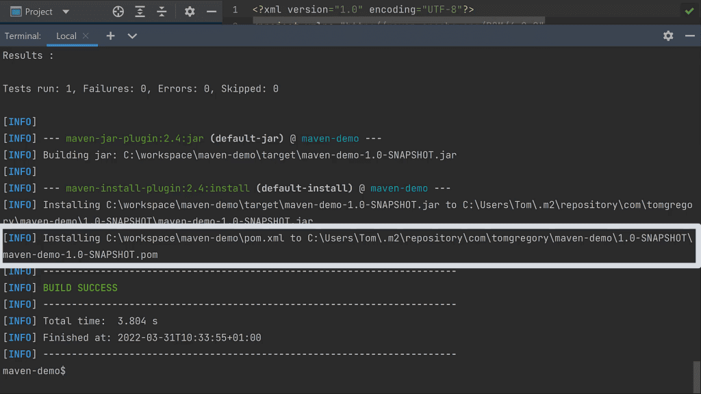 Let's try another phase of the default lifecycle, install, which installs the jar file to our local Maven repository.