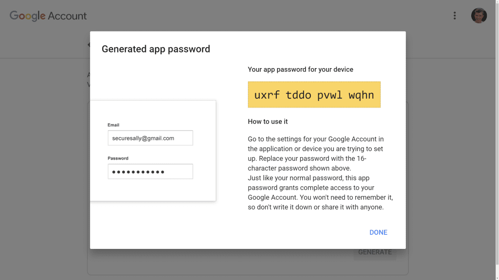 On the next page you can create a new app password by selecting app Mail and device Other (enter AlertManager in the text field). You'll then get a new app password for use in the AlertManager configuration: