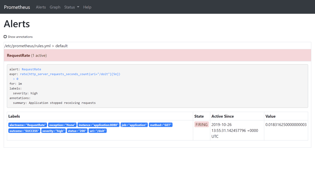 You can keep an eye on http://localhost:9090/alerts to see the status of the RequestRate rule. You may need to wait up to 5 minutes for this rule to change status. It will first go yellow, to indicate it's in the PENDING status. After the for interval defined in rules.yml has passed (in our case 1 minute) it will go red, to indicate the FIRING status.