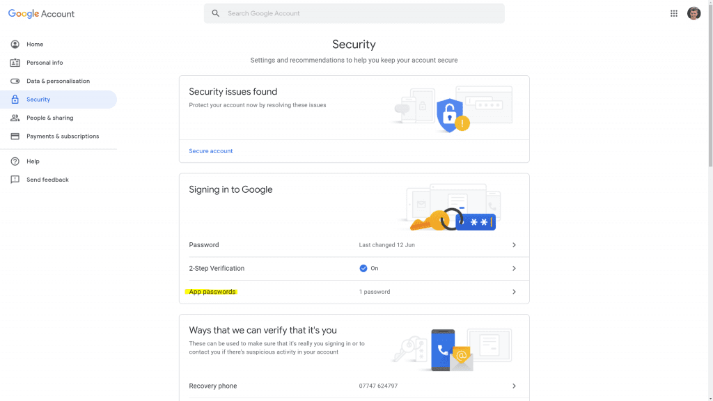 We'll configure AlertManager with a Gmail account, but in order to do this we'll need to generate something called an app password within Gmail. Gmail has a full guide on this, but essentially you need to go the security settings of your Google Account and click on App Passwords under Signing into Google: