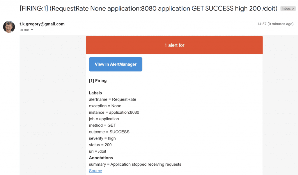 When the rule is in the FIRING status, Prometheus will contact AlertManager to generate an alert. AlertManager will decide what to do with the alert, in our case sending an email.