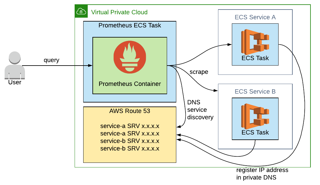 It's worth mentioning that there is another option for Prometheus service discovery for ECS, and that's using DNS SRV records. SRV records can be used to identify individual hosts behind a domain. ECS allows you to configure a discovery service which automatically adds an SRV record into a private namespace for each ECS task.