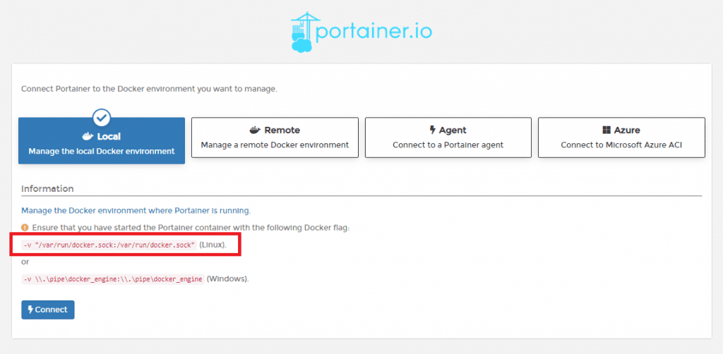When you access the UI at http://localhost:9000, after setting a password it will ask you what Docker environment you want to manage. One of the options is to manage the local environment via the /var/run/docker.sock file: