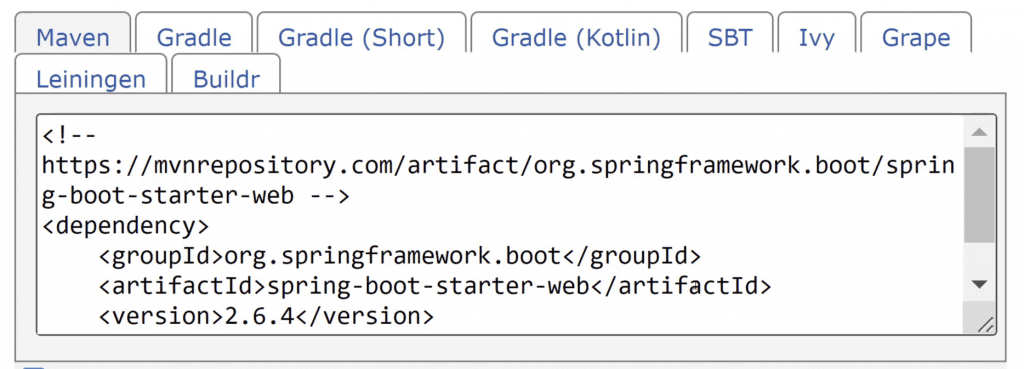 The site also gives you the actual code needed to depend on an artifact in a variety of build tools.