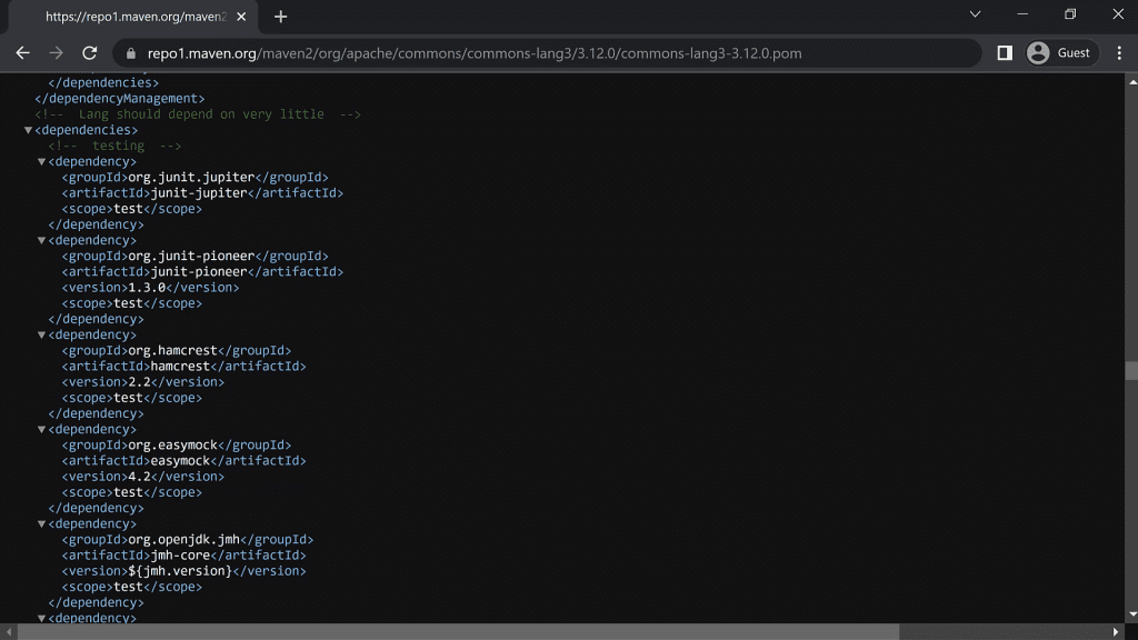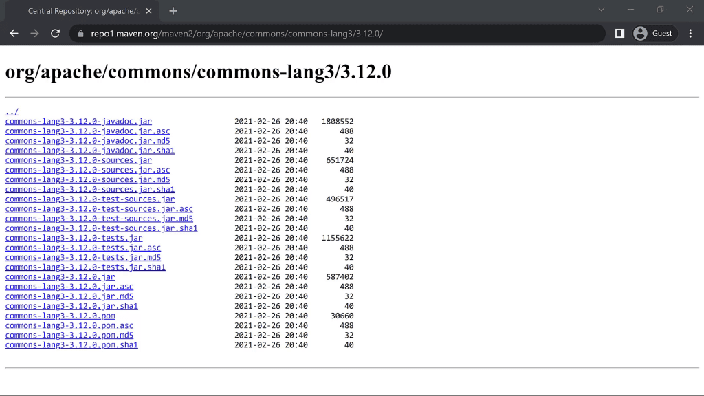 For example, here's how the URL looks for the Apache commons-lang3 artifact within the Maven Central repository.