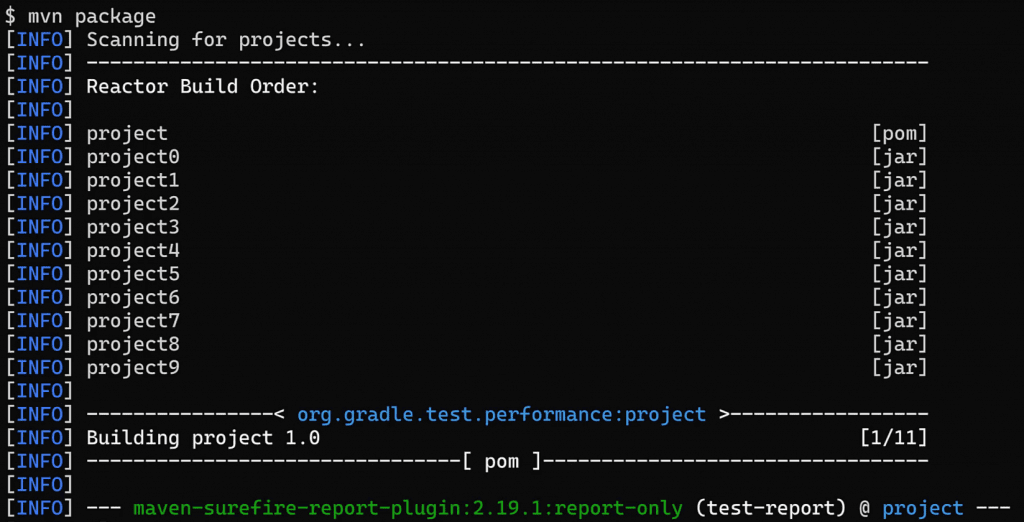 Let's be specific about what faster means, by comparing Maven and Gradle's performance in a real project. This small Java project has 10 sub-modules, each with 50 main classes and 50 test classes. 1,000 classes in total.