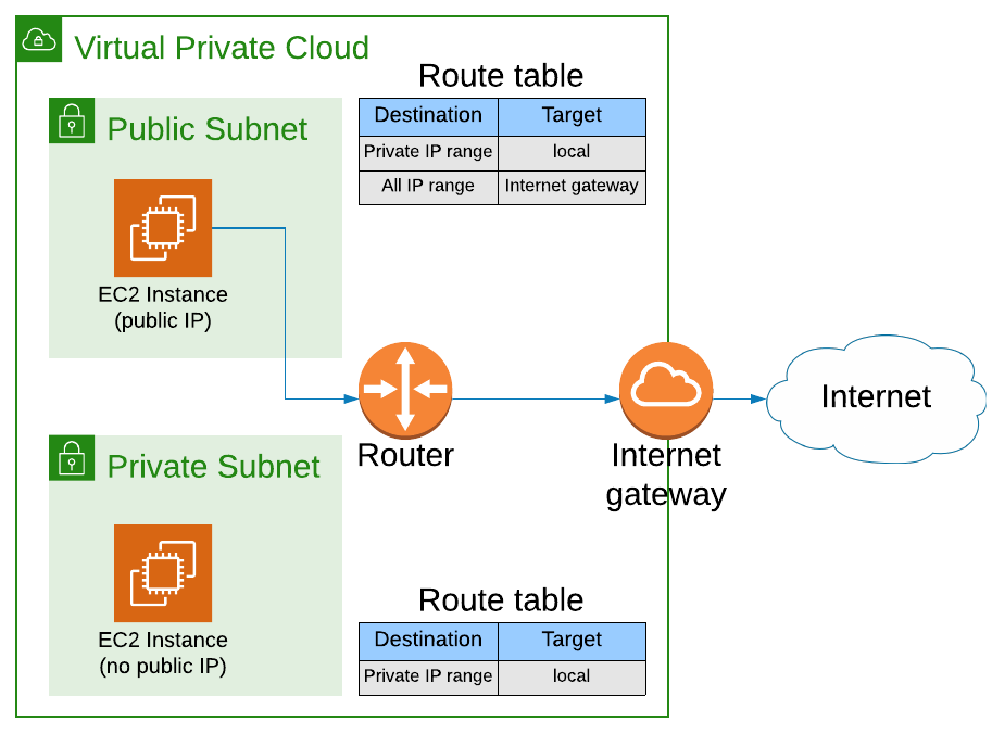 a router, which uses the route table to route traffic within our VPC. Note that the router is implicit i.e. it's not actually a resource we can see in AWS, but we get one automatically with a VPC.