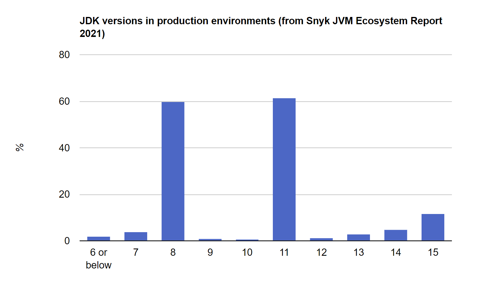 In real life things can be more complicated. Java 8 and 11 are still by far the most popular JDKs used in production at the moment.